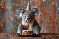Een schattige koala met een verjaardagshoed zit voor een taart omringd door vliegende confetti. Perfect voor verjaardagsgroeten.