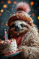 Een luiaard in jaren 70 discokleding viert zijn verjaardag met taart, kaarsen en confetti.