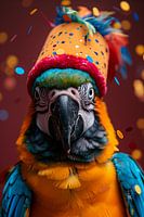Kleurrijke papegaai met feesthoed viert feest in de stijl van de jaren 60 en 70. Confetti en plezier op het verjaardagsfeestje.