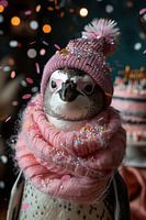 Een pinguïn viert zijn verjaardag, draagt een feestmuts en wordt omringd door kleurrijke confetti in de stijl van de jaren 60 en 70.