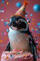 Grappige foto van een pinguïn met een feestmuts en kleurrijke taart tegen een achtergrond van confetti.