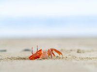 Deze grappig uitziende rode krab met grote blije ogen op het strand van Olón - bij Montañita, Ecuador - is een geschilderde spookkrab. Deze kleurrijke krab komt voor op de Pacifische stranden van El Salvador tot Chili, evenals op de Galápagos-eilanden.