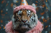 Een vermomde tijger houdt een kleurrijke verjaardagstaart vast en draagt een feestmuts. Concept voor humoristische, feestelijke gelegenheden.