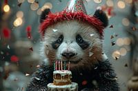 Grappige foto van een panda in een feestelijke bui, met een verjaardagshoed en taart, geïnspireerd door jaren 60 disco mode.