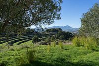 Ontspannen sfeer in de schaduw van een olijfboom, met een prachtig uitzicht op de velden en bergen. In het landbouwgebied tussen Benissa en Calpe hangt de geur van de lente in de lucht. Tussen de olijfbomen groeien klaver en grassen. Door mediterraan zonlicht ziet het groen van de planten er erg weelderig en vruchtbaar uit. In de verte rijst majestueus de bergkam van de Sierra de Bernia op.
