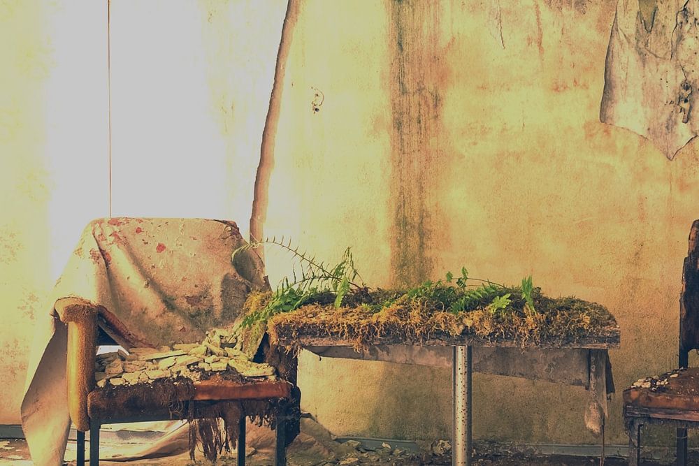Gras, mos en varens zijn de planten die in dit gebouw groeien, niet in potten en ze vragen niet om water