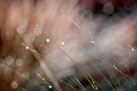 Wagterdruppels op grashalmen gefotografeerd met kleine scherptediepte