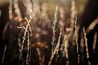Een grashalm in het gouden tegenlicht tekent scherp af tegen de achtergrond.