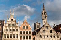 Ghent / Gent Belgium View along the Graslei quayside with its iconic row of medieval houses with their ancient facades. A popular tourist attraction. kloktoren, clock tower, river, kaai, Leie