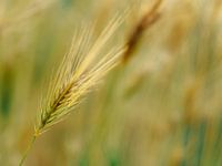 Close up van een grashalm, een aar, tegen een groene achtergrond met beweging. Wuivend gras.