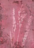 Mixed media - monotype print van bladeren, planten, bloemen en abstracte texturen, penseelstreken, vormen en lijnen. Collage in warme kleuren.