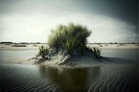 Deze prachtige realistische foto legt de delicate schoonheid vast van kleine groene grassen die uit de toppen van zandduinen groeien, omringd door ondiep, kabbelend water. Tegen de achtergrond van een uitgestrekt woestijnlandschap baadt de scène in natuurlijk licht dat de complexe texturen van zand, water en vegetatie benadrukt. De kalme en serene compositie straalt een gevoel van eenzaamheid en onvergankelijkheid uit, waardoor het een perfecte match is voor natuurliefhebbers en landschapsfotografen.