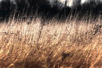 Het lijkt net of Repelsteeltje aan het werk is geweest. Het rietachtige gras lijkt van wel van goud. Het donkere achtergrond geeft een contrasterend effect.