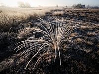 Een losstaande graspol is helemaal bedekt met rijp. Op dit heidveld staat veel gras tussen de heideplanten.