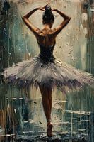 Haar handen zijn boven haar hoofd gevouwen terwijl ze elegant op haar tenen balanceert. De donkere kleuren van haar outfit contrasteren subtiel met de zachte en dromerige achtergrond van lichtgroen en beige. De penseelstreken zijn expressief, vooral in de beweging van haar tutu, die lijkt te bewegen door een onzichtbare wind. Het gevoel van beweging wordt verder versterkt door de verfspatten en druppels die over het doek zijn verspreid, alsof de dans de omgeving beïnvloedt. Dit werk vangt zowel de technische beheersing als de artistieke gratie van de dans, waarbij de kijker wordt meegevoerd in de wereld van de balletkunst.