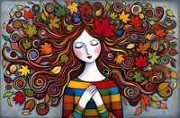 Een kunstwerk met mooie intense natuur-tinten. Een meisje wat een dankbare houding uitstraalt. Dankbaarheid is een mooi gegeven en het is goed als we af en toe stilstaan wat we elke dag mogen ontvangen...