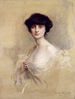 De vrouw van adel staat hier op het portret met een lichtkleurige jurk, spannend erotisch over haar schouder met een diep decolleté haar boezem deels onthullend.