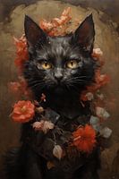 In de diepten van "Het Geheime Hof" vinden we de verbluffende Gravin van de Herfstrozen. Dit portret toont een zwarte katachtige schoonheid, met ogen die de mysteries van het hof lijken te kennen. Haar vacht is als fluweel tegen de achtergrond van vallende bladeren en ontluikende rozen. De levendige rode en zachte roze tinten van de rozen contrasteren prachtig met haar donkere verschijning, waardoor een visueel spektakel ontstaat dat de toeschouwer betovert. Haar houding is er een van rustige zelfverzekerdheid, en men kan de fluisteringen van geheimen en verhalen uit het verleden in haar ogen zien. Haar nek en schouders zijn sierlijk gedrapeerd met een mengeling van herfstbladeren en bloemen, wat aangeeft dat ze een figuur van betekenis is tijdens het herfstseizoen binnen het hof. Haar aanwezigheid straalt zowel gratie als kracht uit, een perfecte belichaming van de overgang tussen seizoenen in "Het Geheime Hof". Dit beeld van de Gravin is een viering van de cyclische natuur van het leven, waarbij elk seizoen zijn eigen schoonheid en mysterie heeft.