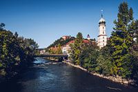 De foto toont een uitzicht over de Mur naar de toren van de Franciscaner kerk, met de kasteelheuvel op de achtergrond.