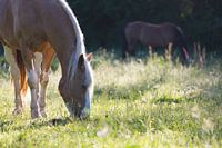 Dit knappe Franse paard graast heerlijk met de kudde in het avondzonnetje. Die zon is ook degene die de sfeer in deze foto afmaakt.