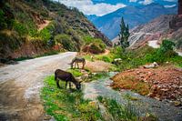 Over ‘Grazend vee in de berm van een bergweg in de Heilige Vallei, Peru’ van Rietje Bulthuis