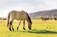Prachtige opname van Konikpaarden in de namiddagzon in nationaal park de blauwe kamer in Wageningen