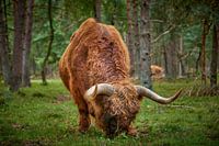 Een Schotse Hooglander stier graast tussen de bomen in een natuurgebied bij Wezep op de Veluwe, in Nederland.