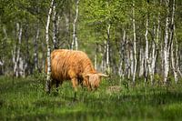 Grazende Schotse hooglanders in een bos van berken bomen eten de grassen en de plantjes tussen de bomen vandaan zodat de bos mooi blijft en niet overwoekerd raakt!