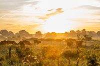 Mooi zonsopkomst met grazende koeien in de wei, prachtige landschap met tegenlicht in de dauw.
