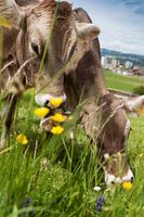 Koop dit koeien kunstwerk Grazende koeien op een Zwitserse weide van Besa Art op canvas, aluminium dibond, (ingelijste) fotoprint, behang en ArtFrame, op maat geprint in Fine-Art kwaliteit.