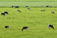 Koeien grazen in de wei tijdens een mooie lente dag. In de achtergrond ligt een vers gemaaid weiland met gras dat droogt in de zon.