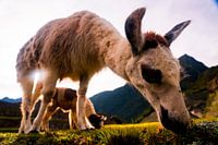Een kudde wollige lama's eten bijna de camera op en genieten van de grassige weiden in het hooggebergte van Cuzco, Peru. Met de zon en prachtige bergtoppen op de achtergrond is het een vredig tafereel. Iedereen houdt van deze schaap kamelen omdat ze een grappig en knuffelbaar uiterlijk hebben.