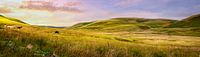 Aan het begin van de herfst kleurt het gras geel. Een donkere lucht hangt boven de nog net door de zon verlichte heuvels.