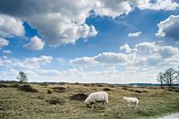 Nationaal park Drents Friese Wold en de Kale Duinen met grazende schapen. Prachtige Hollandse wolkenluchten boven schrale graslanden en vergezichten.