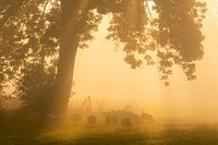 Op een mistige ochtend grazen de schapen onder een boom in het buurtschap Hemert in de buurt van Lellens in de provincie Groningen.