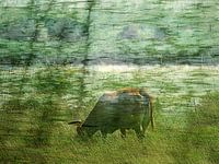 Voorbijglijdende omgeving. Pril groen lenteblad, groen grijze bomen, weilanden en struiken. Daartussen een grazend rund. Momentopnamen. Verstild fragment van de voorbijrazende wereld tijdens een autorit.