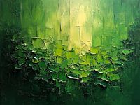 Dikke, expressieve verfstreken in groentinten bouwen een landschap van textuur op. De verf ligt zichtbaar op het doek, als reliëf dat je bijna kunt aanraken. Donkergroen vloeit in moskleur en helder lime. Het schilderij voelt levendig, aards en tastbaar als groeiend groen.