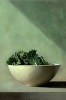 Green Whisper - Dit stilleven schilderij toont een schaal met frisse groene boerenkool geplaatst op een houten oppervlakte tegen een zachtpaarse achtergrond, waarbij de focus ligt op de textuur en tinten van de groente.