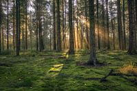 Zonnestralen met zonsopkomst in een bos vol paddenstoelen.