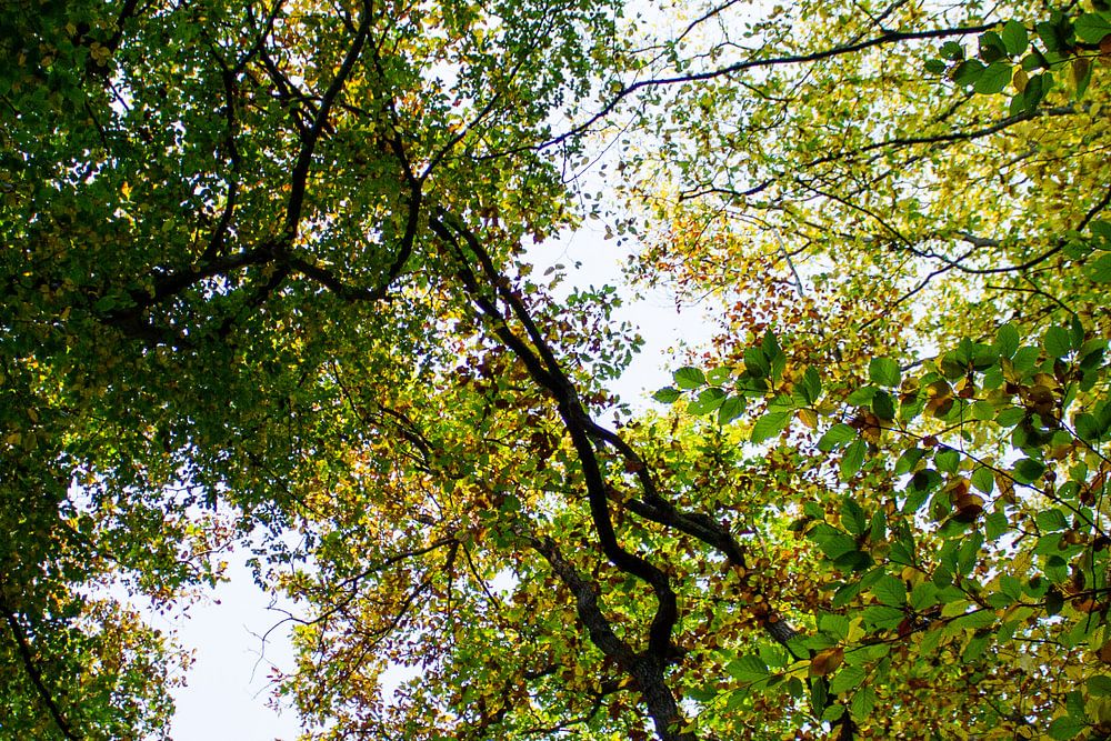 Een kijkje naar de toppen van de bomen. De bomen sluiten langzaam het licht buiten het bos. Door de licht inval komen de groene kleuren van het bos duidelijk naar voren.