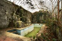 Een verlaten oranjerie waar het zwembad langzaam wordt overgenomen door de natuur.