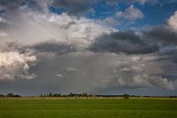 Om schitterende lucht boven een wijds Fries landschap met boerderijen en koeien