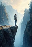 Het schilderij "Grenzen des Möglichen" (Grenzen van het mogelijke) toont een jonge man die op een indrukwekkende rotsformatie staat en naar de eindeloze uitgestrektheid van een adembenemende kloof staart. Omgeven door majestueuze, steile bergen geeft het landschap een gevoel van grootsheid en isolement. De lucht baadt in zachte kleuren,…