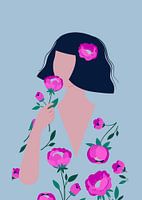 Veel roze en pioenrozen in dit werk, op een Scandinavisch grijsblauwe achtergrond.