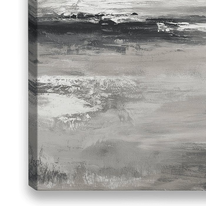 Een abstract landschap in grijstinten, met reflecties en atmosferische effecten. De compositie is open en ingetogen, waardoor het werk rust brengt zonder afleiding.