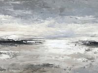 Een abstract landschap in grijstinten, met reflecties en atmosferische effecten. De compositie is open en ingetogen, waardoor het werk rust brengt zonder afleiding.
