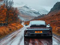 Een stoere grijze Porsche 911 GT3 snijdt door de kronkelende wegen van de Schotse Hooglanden. Mistige heuvels en ruige bergen omringen de sportwagen, terwijl de zon door de wolken breekt. Het natte asfalt weerspiegelt zijn gestroomlijnde silhouet, en de achterspoiler verraadt zijn brute kracht. Pure snelheid in een adembenemend landschap.