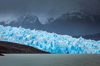 Grey gletsjer in het nationale park Torres del Paine. Op de foto is een deel van de tong van de gletsjer te zien met donkere bergen op de achtergrond. Lago Grey is op de voorgrond te zien