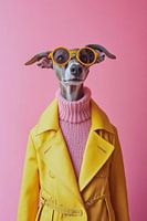 Gekleed in helder geel straalt deze stijlvolle windhond charmante elegantie uit. Met een roze vest en een opvallende zonnebril voegt hij een vleugje glamour toe aan de dag. De combinatie van een slank silhouet en vrolijke kleuren verenigt moderne flair met unieke charme, terwijl de zachtroze achtergrond de speelsheid benadrukt.