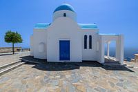 Blauw-witte kerk boven de zee, de Profeet Elias Kerk boven het bergdorp Nikia op het vulkanische eiland Nisyros in Griekenland